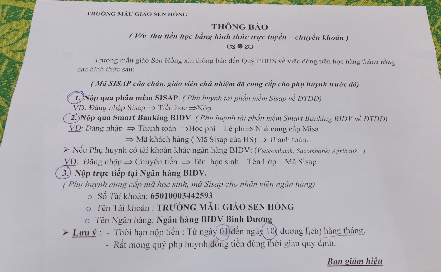 THÔNG BÁO VỀ VIỆC THU TIỀN HỌC PHÍ QUA MẠNG SISAP